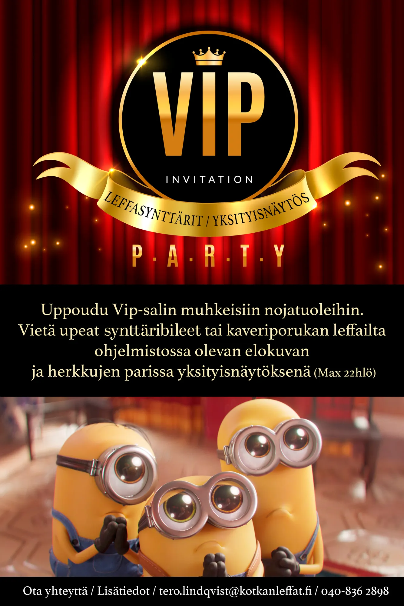 Vuokraamme tiloja erilaisiin yritystilaisuuksiin ja järjestämme myös yksityisiä elokuvanäytöksiä, joko ohjelmistossa olevasta tai muusta saatavilla olevasta elokuvasta. Räätälöimme juuri Teidän tarpeisiin sopivan tilaisuuden!